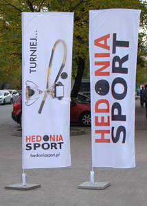 Hedonia Sport mająca w ofercie wynajem kortów do gry w squash'a zamówiła dwa komplety winderów PRO-MIDI składających się z flagi z wydrukiem, ponad dwu i pół metrowego masztu i podstawy napełanianej wodą lub piaskiem. Niewątpliwie istotnym elementem masztu jest elastyczna szczytówka wykonana z włókna szklanego rozpinająca pięknie flagę, dodatkowo obciążoną małym woreczkiem.