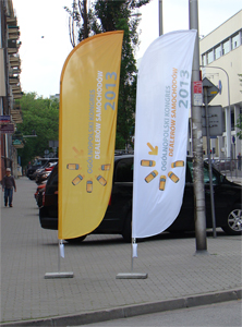 To już kolejny z rzędu Ogólnopolski Kongres Dealerów Samochodów, który nie może obejść się bez odpowiednej reklamy. Zrealizowaliśmy zamówienie na flagi do masztów zamówionych u nas przed kilku laty. Podkreśla to jedną z zalet winderów, mianowicie możliwość swobodnej wymiany nadruków bez konieczności kupowania całego systemu. Jeżeli jeden element kompletu jak na przykład flaga, ulegnie zużyciu bądź po prostu mamy chęć wymienić wydruk na coś "świeżego" wówczas nie ma najmniejszego problemu, żeby zamówić jedynie zużyty element, który zastąpi poprzedni. Z tego względu część naszych stałych klientów zamawiając zwłaszcza większe ilości winderów zamawia do nich same flagi.