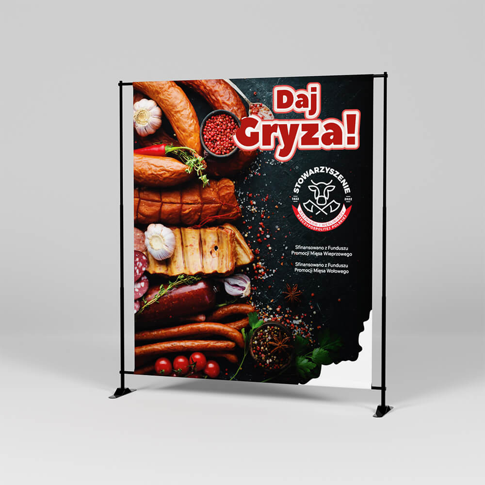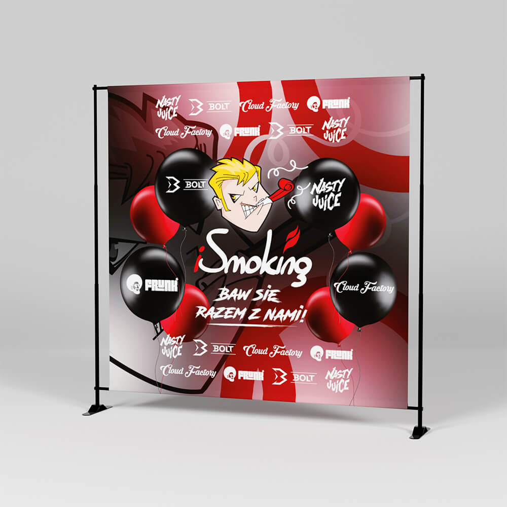 Reklama w formie nadruku na materiale PCV wykorzystywanym do produkcji banerów. Stelaż wykonany z aluminium zapewnia solidne naprężenie i utrzymanie nadruku w najlepszej postaci. Wydruk ścianki reklamowej montowany jest za pomocą tuneli w banerze, przez które wkładane są rurki stelaża.