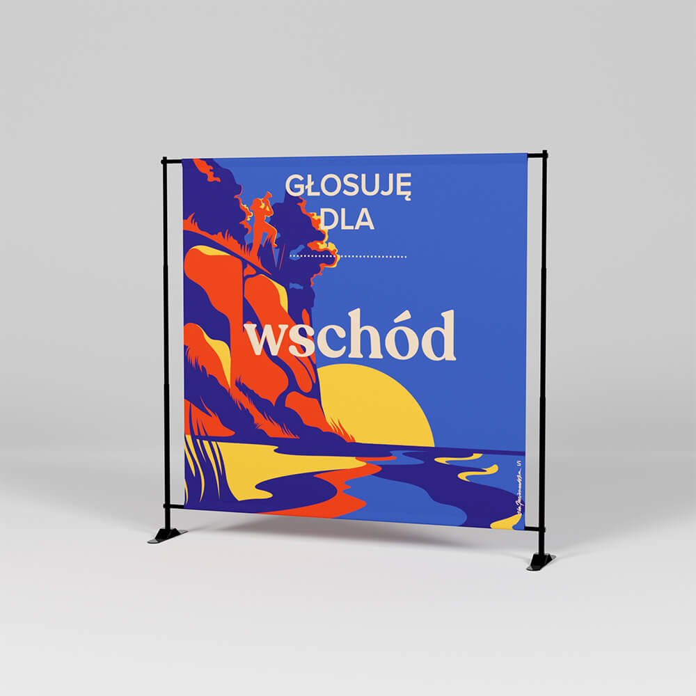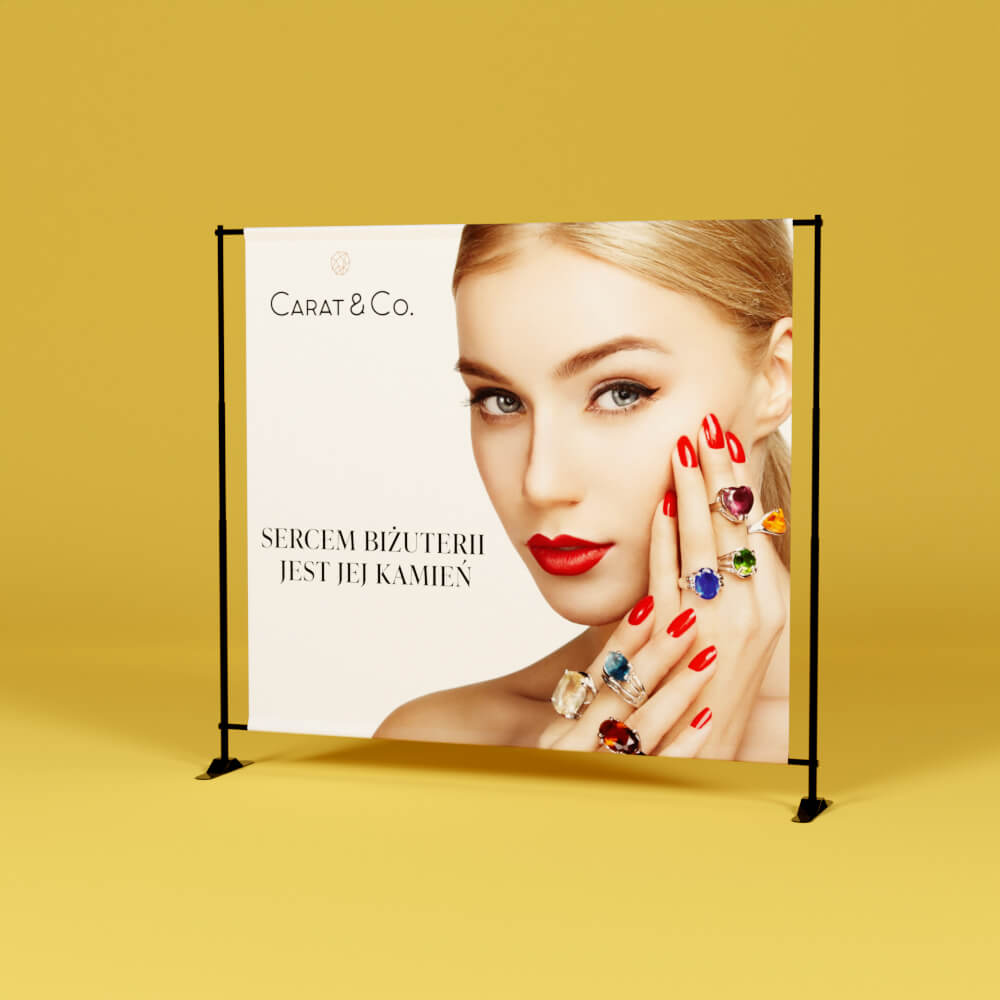 Baner na stelażu teleskopowym z regulacją wymiarów.