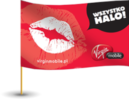 Flaga dla Virgin Mobile ma wymiar 1.5mx0.9m. Po lewej stronie uszyty został tunel zamknięty na górze, w który włożyć można dostępny w naszej ofercie drzewiec długości 1.5m.